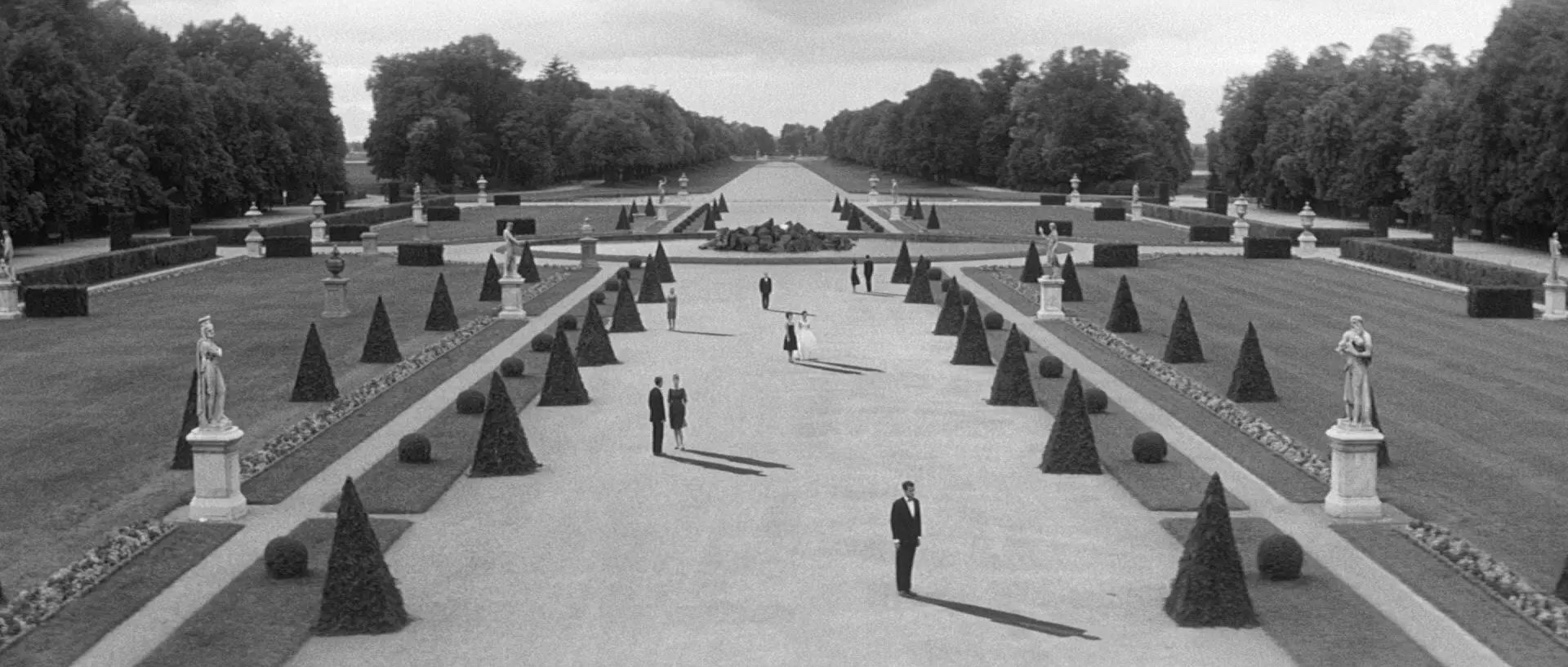 Tout a bien lieu « en même temps ». Seul le temps du film est réel, comme choix d’un assemblage parmi d’autres, qui seraient tout aussi valables. Même l’équipe du film ne savait ce que donnerait l’œuvre achevée, et Resnais rêvait, à propos de son deuxième long métrage, d’un film dont on pourrait librement inverser les bobines… Pas étonnant que le film envoûte. Quel drôle d’endroit pour être libre ! s’exclame un couple. En effet, puisque tout, dans le décor, du château au jardin à la française est géométrique, formaté, rigide…