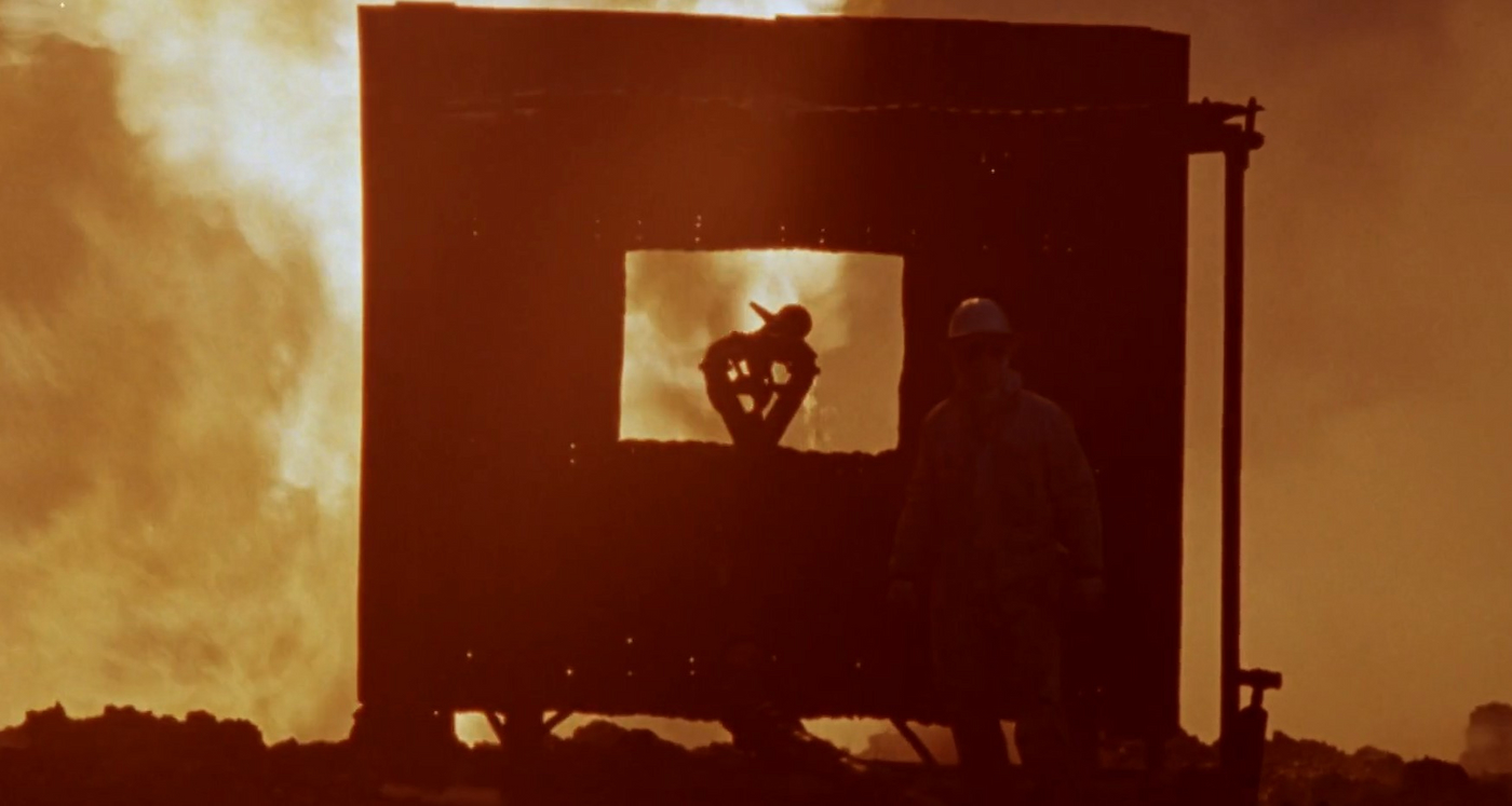 Les incendies et – en particulier – la lutte héroïque pour les éteindre ont fait l’objet d’un documentaire américain réalisé par David Douglas, Fires of Kuwait, sorti en IMAX en 1992 et nommé à un Oscar. La même année, sort également un autre documentaire, réalisé par Werner Herzog et produit pour la télévision (Canal+ et Première). Il se distingue de celui de David Douglas par une approche artistique aux antipodes des canons habituels du documentaire… Herzog, artiste au regard unique, a en effet choisi de filmer la catastrophe environnementale et humaine comme s’il abordait une planète inconnue ! Ce prisme surprenant de la science-fiction métaphysique est particulièrement bien servi (et justifié) par des images incroyables, captées au cours d’un tournage de tous les dangers, principalement en hélicoptère. Paysages lunaires de désert et de lacs de pétrole, structures anéanties (bunkers, hangars, réservoirs…) semblant appartenir à une civilisation depuis longtemps éteinte : c’est bien l’horizon infini d’une planète hostile, où toute trace humaine a disparu, que filme le cinéaste allemand. Dans un second temps, sa caméra pénètre au cœur des ténèbres : les puits de pétrole en feu, qui prennent ici l’allure de volcans rageurs qui annihilent la vie et transforment le ciel en une nuit permanente. Dans la fournaise se débattent d’étranges créatures, que Herzog assume de représenter d’abord comme des extra-terrestres dont on essaye de comprendre le langage et le comportement, avant de leur rendre un semblant de forme humaine : les héroïques employés des compagnies spécialisées américaines, qui passeront neuf mois dans cet enfer afin d’éteindre les incendies. Le metteur en scène pousse le principe jusqu’au bout. Ainsi, lorsqu’il pénètre dans un atelier lambda, il filme des outils divers comme des « objets trouvés dans des salles de torture », pour reprendre le titre de cette section du film ! Une preuve supplémentaire que le cinéma peut conférer à n’importe quelle image le sens qu’il souhaite…